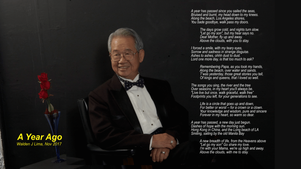 After Papa quit smoking around 1981 (Around 1981-82 he made a pact with his chain-smoking friends, Cesar Cuyugan and Colonel Henry Mapa to quit smoking, and they all did). He became more and more entrenched in physical fitness. For more than 30 years, Papa and Mama practiced daily exercises of LTK (Luk Tung Kuen) for 35 minutes – yes everyday, this is always followed by dance for another 20 minutes, and then swimming for at least an hour. This was a daily morning routine for more than 30 years! His last physical exercise was on Sep-6, 2016, when he off-balanced and fell. He was 88.