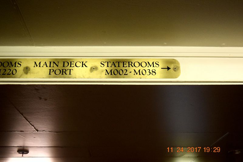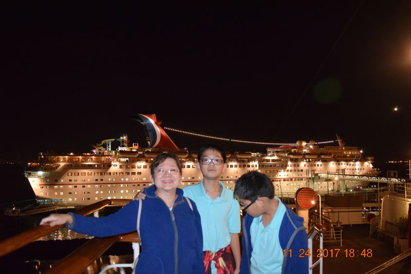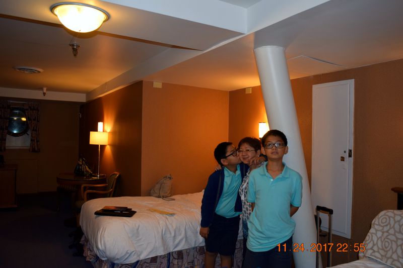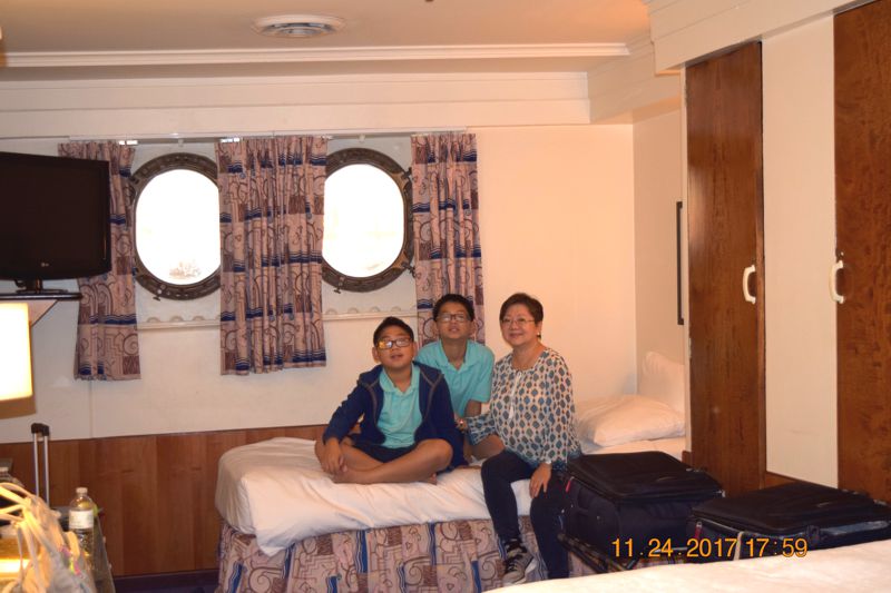 Everything seems to be perfect, until we entered our room M038. It was still warm or as Matt Matt would say, even warmer. I called the Front Desk and was told that he will move us to another room and was told to bring all out things. However, arriving at the Front Desk, the lady clerk did not know anything about the move, and was informed that she will turn on the AC, which at that moment, I must have raised my voice, for Matthew was reminding me to not be “suko”. Finally the clerk gave us another room, B468, says it will be a bit farther to the end of the ship if we agree. I readily says it will be ok as long as the AC is working. We went, and I called in to confirm that yes, we will take the replacement room. It was a bit smaller, one window, and 2 tiny beds, and a 24″ diameter round post sticking out diagonally from floor to ceiling. Oh well, still this will be good for the night. Everyone went flat-tire in a few minutes!